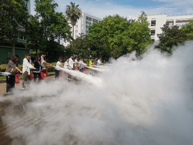 消防安全讲座后,药科楼B栋烟雾弹燃起,逃生演练正式开始。药科楼A、B、C三栋楼同时响起消防警报,全体楼内师生进行疏散演练。疏散演练后,200余位一年级研究生被分为20组,在B、C栋楼前空地开展灭火器使用实操。