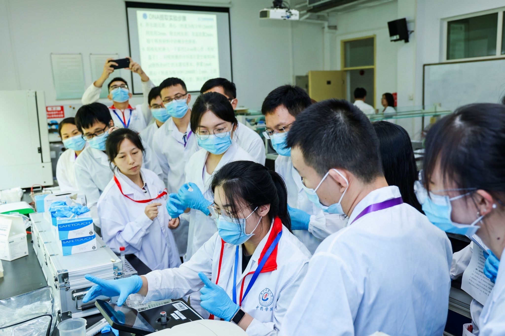 团队成员各司其职,会务助理及实验助理积极应对各自的任务,热情迎接参会人员入校、实验室与休息室路线引导、培训班签到、协助广东省药品检验所的老师准备实验器材、实验操作展示、应急机动等各项工作,保障了聚合酶链式反应法技术培训顺利进行。