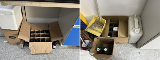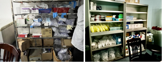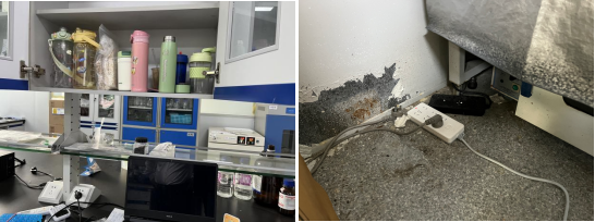 部分实验室也依然存在安全隐患及卫生等问题及需落实整改。其中C110室问题较多,需重点整改,主要包括:(1)实验室放置食物、饮用水杯;(2)插座放置地上,存在较大的安全隐患;(3)桌面堆放使用过的手套、试剂等,灰尘较多;(4)纸箱堆放于过道,阻塞通道;(5)大量试剂放置实验桌下、门后,未存放于试剂柜。