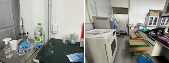 个别实验室也存在一些安全隐患问题:(1)试剂清单破损未及时更换(C108室);(2)大量试剂放置地面,未存放于试剂柜(C108室)。(3)实验室门外未张贴安全责任人信息牌(C113室)。(4)实验室内窗台堆积大量灰尘(C105室)。