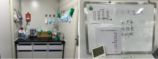 C114室物品整理规范、标识明确,干净整洁(左图); C104室值日安排规范,检查事项落实到位(右图)。