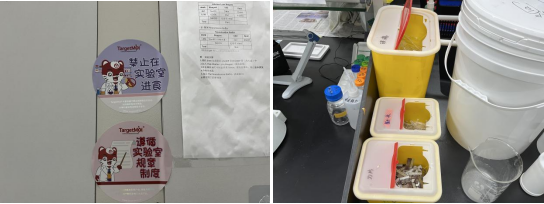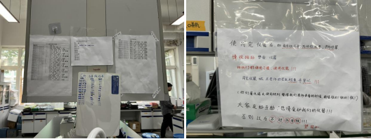 C109室管理规范,张贴了实验室值日表、仪器预约表、仪器使用注意事项、实验室安全宣传标语等;锐器回收规范,张贴明确标识。