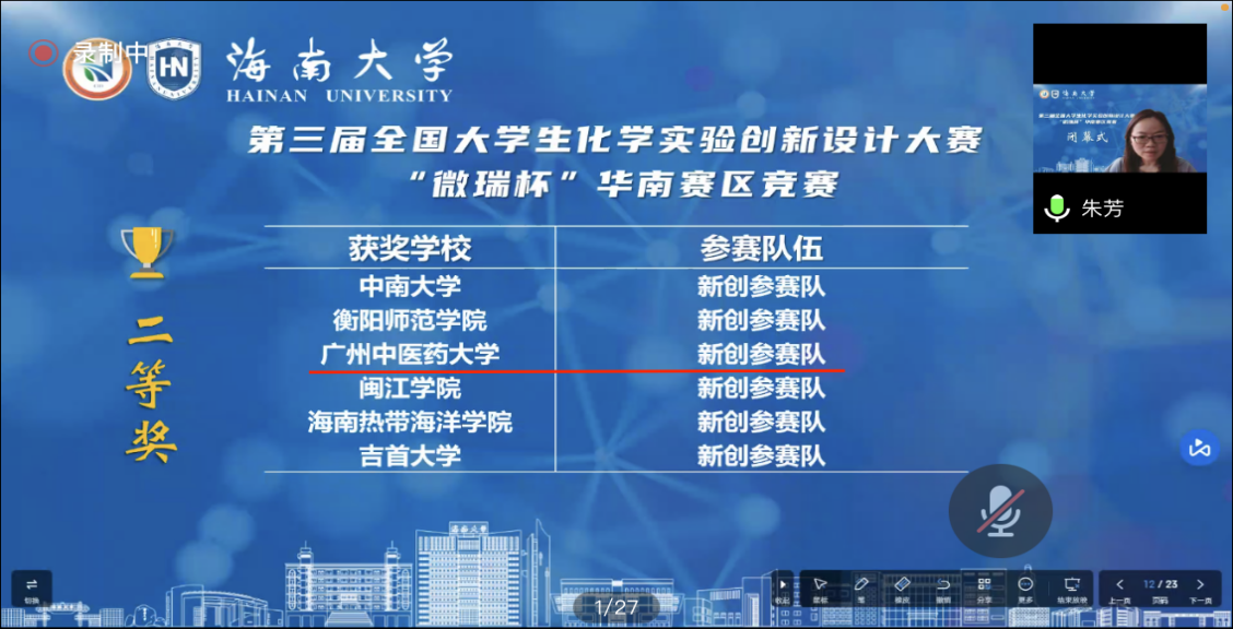 7月26日,第三届全国大学生化学实验创新设计大赛华南赛区决赛在海南大学闭幕。必赢3003no1线路检测中心尹利娜、胡庆忠老师指导本科学生(成员:郑培森、张琳童、周悦)参赛的“新型多组分反应构建类天然产物的优势骨架用于创新药物发现”实验项目荣获华南赛区二等奖!本次大赛共有61所高校参加,包括中山大学、厦门大学、中南大学、华南理工大学、湖南大学等诸多双一流高校。大赛历时三个多月,学院团队经过两轮激烈的淘汰赛,最终荣获二等奖的好成绩。