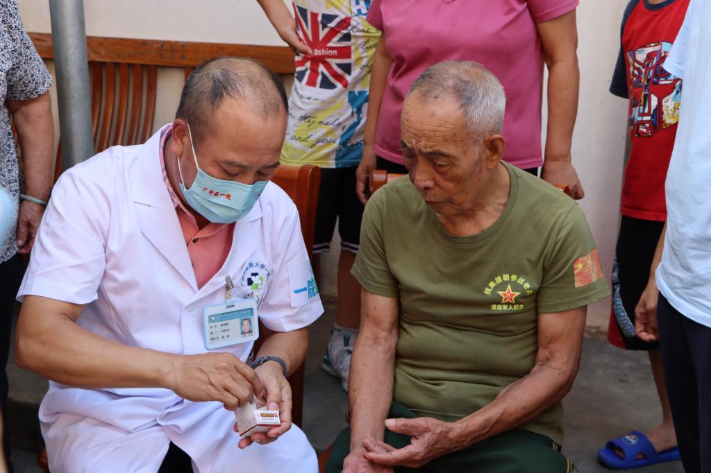 7月25日,必赢3003no1线路检测中心师生与一附院专家团队一道,顶着烈日高温,历经3小时车程,来到罗定市泗纶镇,上门为抗美援朝老英雄沈金水送医送药。