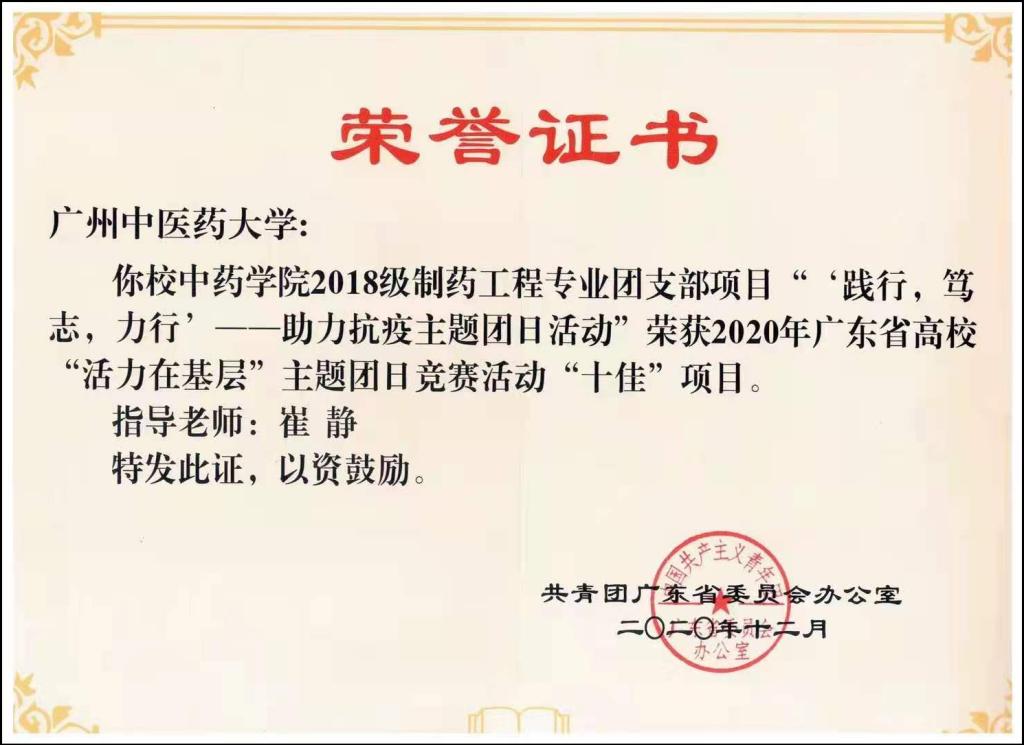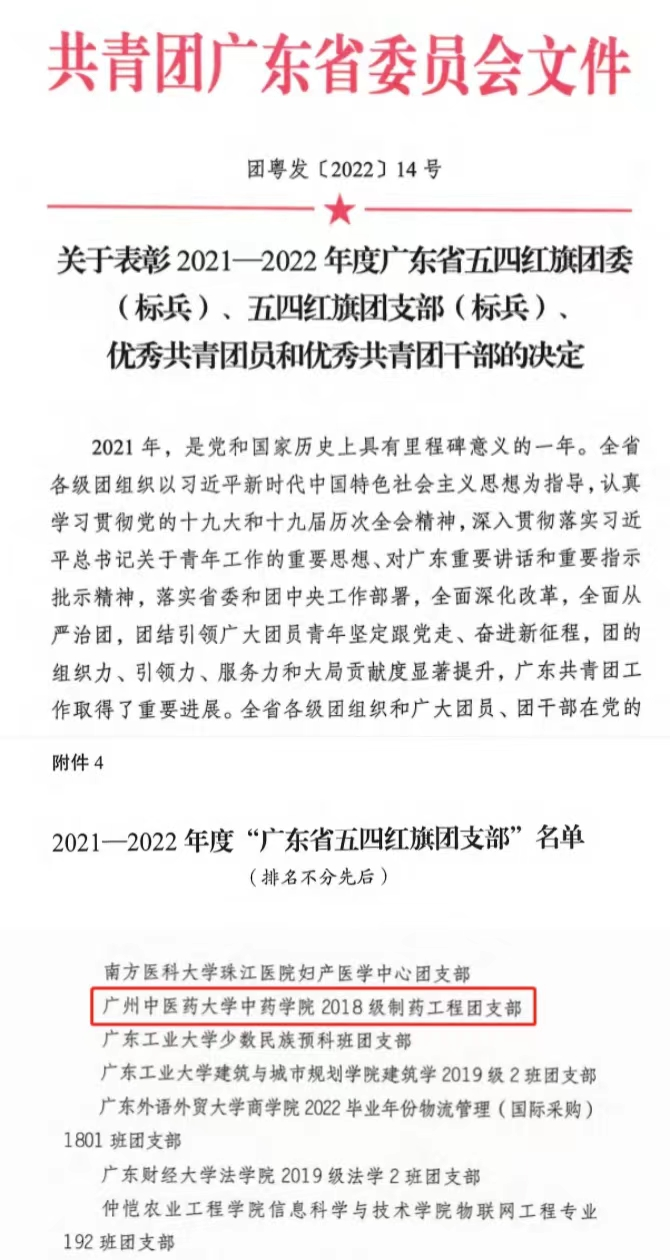 在庆祝中国共青团成立100周年之际,团省委公布了广东省“五四红旗团委(标兵)、五四红旗团支部(标兵)、优秀共青团干部、优秀共青团员”的名单,必赢3003no1线路检测中心18级制药工程团支部荣获“广东省五四红旗团支部”称号。